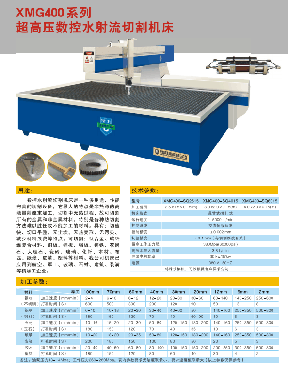 2.切割易燃性材料,塑料、布料、聚氨酯、木材、紙品、皮革、橡膠等,以往的火焰切割根本無(wú)法加工這些材料,但水切割加工不會(huì)產(chǎn)生燃燒,可以對(duì)上述材料進(jìn)行任意切割,被切割材料的物理、機(jī)械性能不發(fā)生改變,這也是水切割的一大優(yōu)點(diǎn);